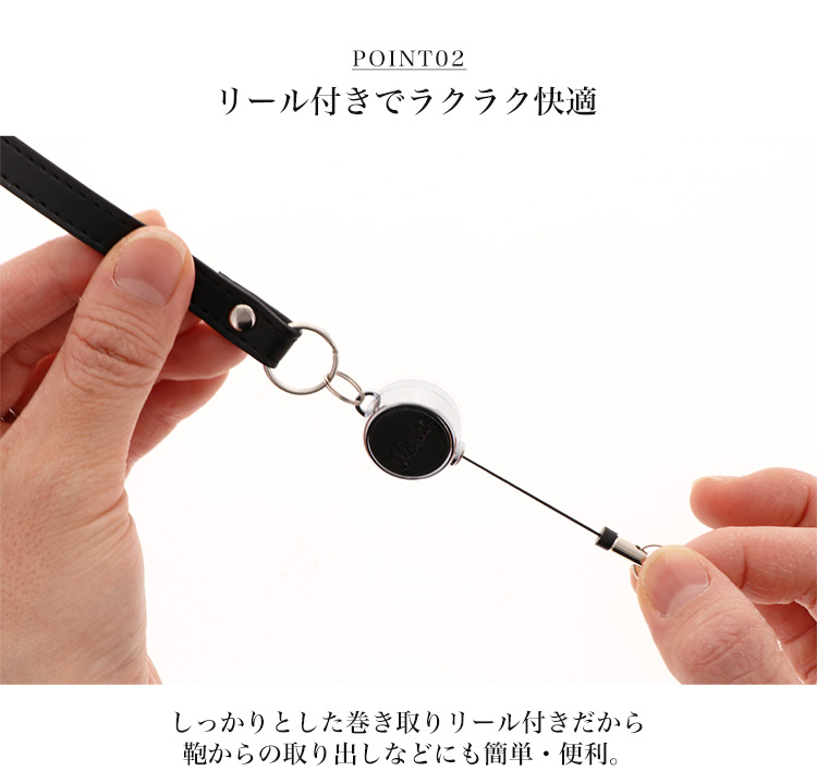 伸縮するリール付きなので、つなげると改札でタッチするときに便利です。